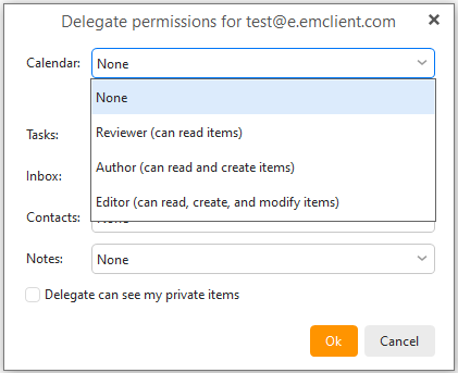 access to the delegated account by choosing to allow reading, creating, or modifying items, or any