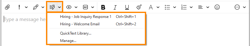 You can also use keyboard shortcuts to insert specific QuickTexts. The default keyboard shortcut is Ctrl + Shift + number. You can see the shortcuts next to each of your QuickTexts in the drop-down menu.
