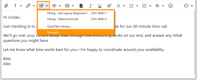 QuickTexts let you predefine text snippets or full replies and quickly insert them into your emails - perfect for saving time when you need to reuse the same content.