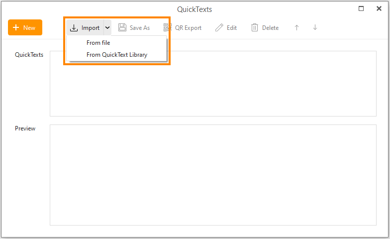 You do not have to create your QuickTexts from scratch - click the Import button and either import QuickTexts from a file (.html or .htm) or try importing them from our QuickText library: