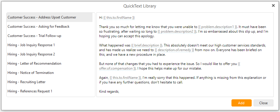 The QuickText library was added in case you needed a little inspiration when creating your QuickTexts. You can use the available text snippets as they are or adjust them to your needs.