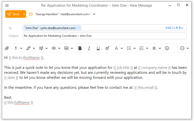 Before you send out the message, replace the Placeholders with personalized data as needed.