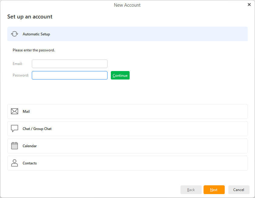 Click the "+ Add account" button. The account wizard window will appear. Now simply enter your Variomedia email address and confirm. Enter your password and click Continue.